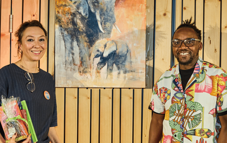 Künstler Mande aus Uganda malte, was für ihn SICHERHEIT bedeutet. Er spendete das Bild an unser Projekt. Es ist bis 10. Dezember im Rahmen der Ausstellung SICHER gesehen im ART.SPACE in Krummnußbaum ausgestellt.